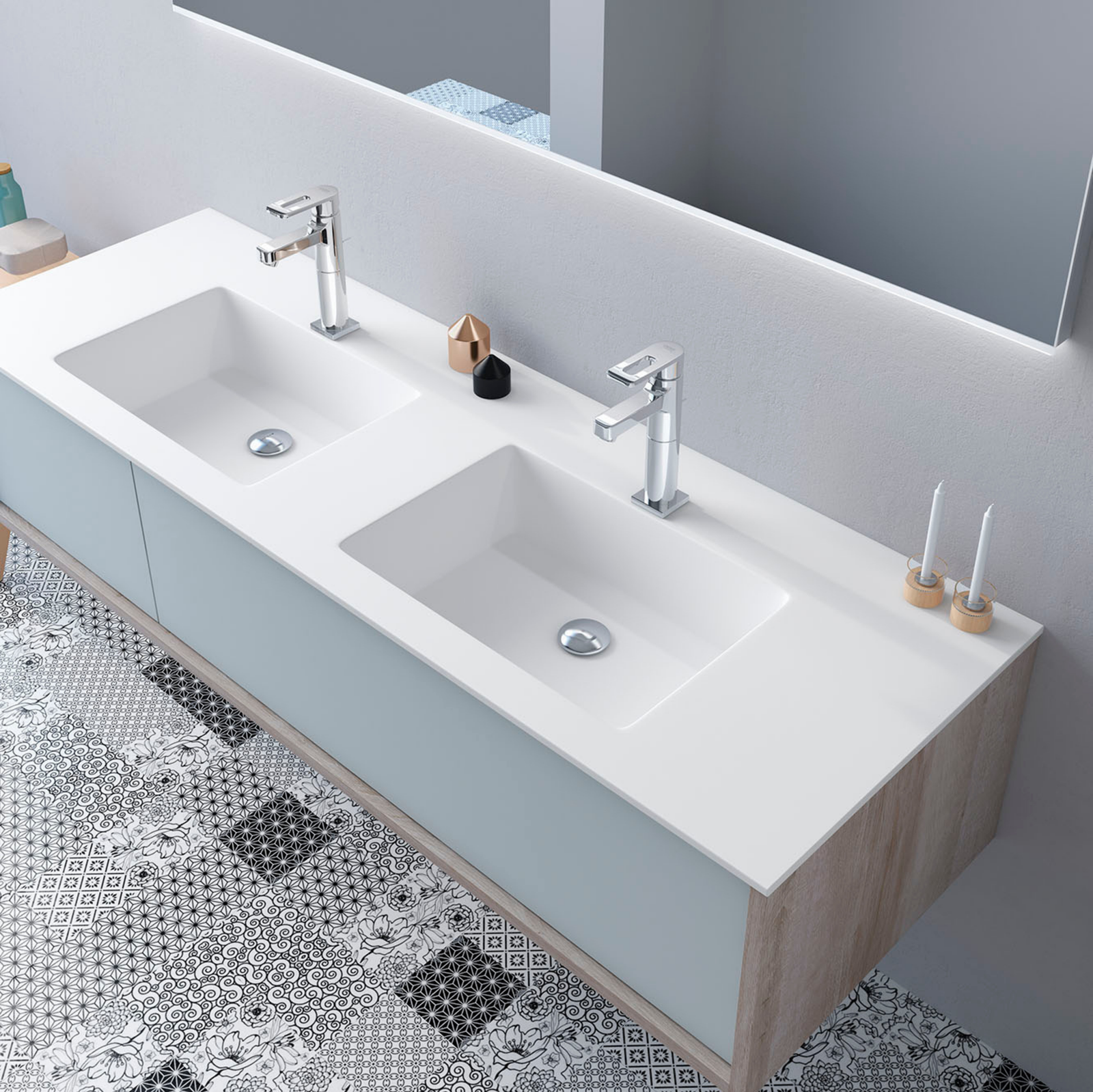 La encimera Solid Surface Tabac presenta un diseño simétrico con doble cubeta integrada, ideal para baños compartidos o de gran uso diario. Su estética moderna y minimalista, unida a la precisión en sus acabados, ofrece un resultado funcional y elegante que encaja a la perfección en ambientes contemporáneos.