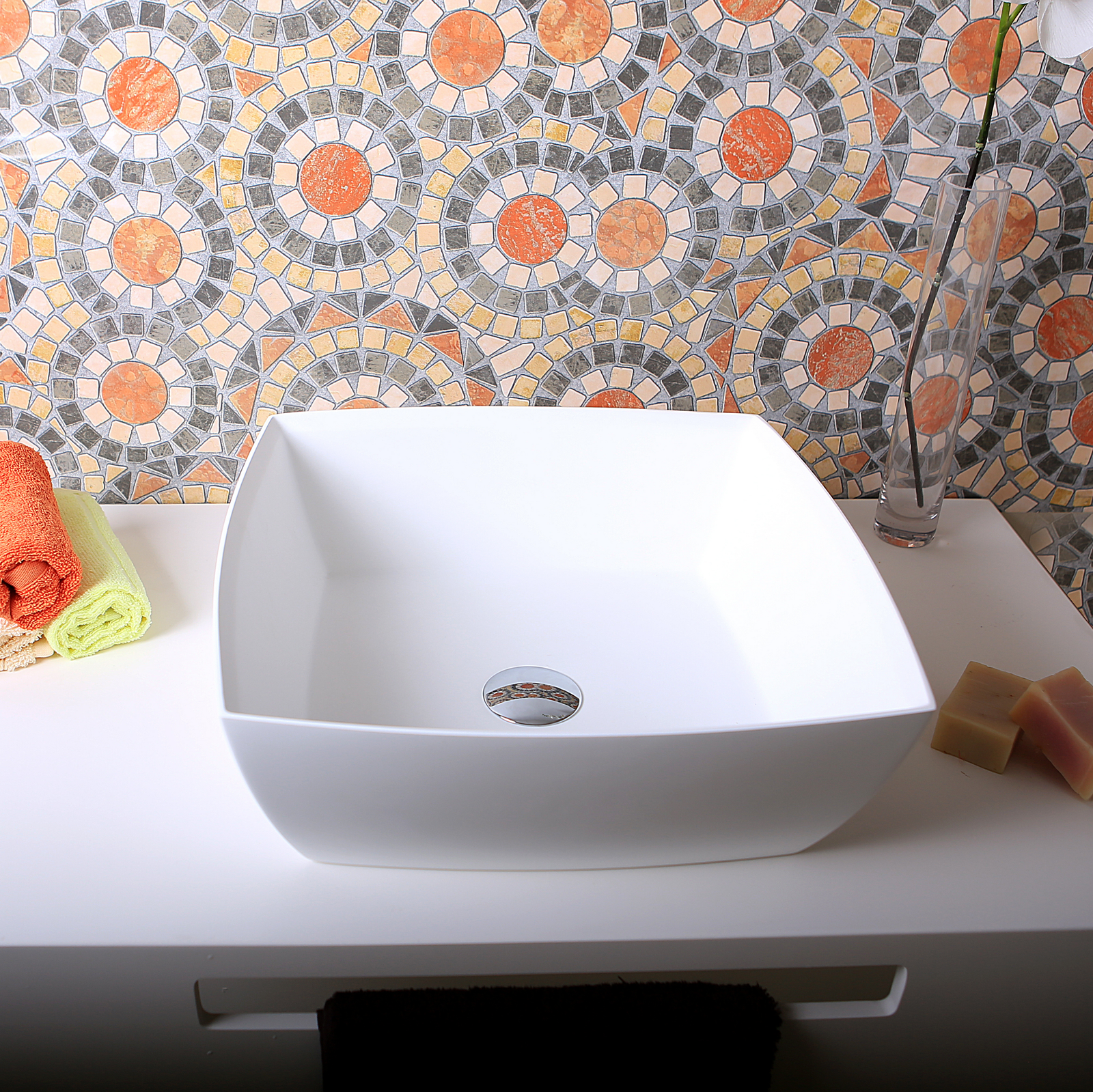 El lavabo sobre encimera Tinos se caracteriza por su diseño moderno y forma cuadrada con bordes suavemente curvados, que aporta una estética equilibrada entre líneas rectas y fluidez visual. Esta pieza destaca como un elemento decorativo que también cumple con altos estándares de funcionalidad y confort.