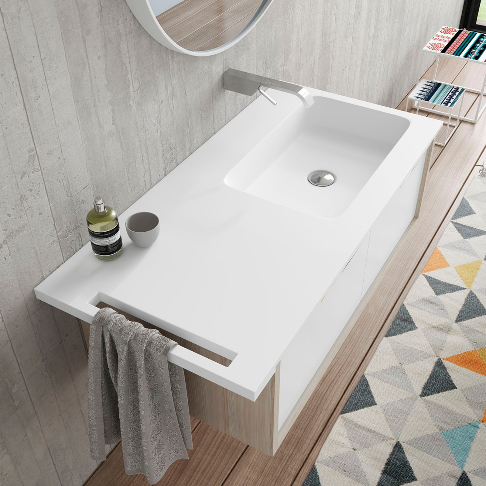 Diseñado para integrarse en la parte superior de la encimera, este toallero es ideal para baños que buscan funcionalidad sin renunciar al diseño. Su colocación facilita el acceso a la toalla y permite mantener el orden en el espacio de uso diario. Es especialmente útil en proyectos de interiorismo contemporáneo, donde la estética minimalista y la practicidad se combinan en cada detalle.
